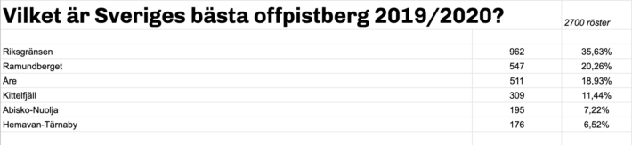 2700 röster har räknats och härmed kröns Riksgränsen till ”Sveriges bästa offpistberg” säsongen 2019/2020. Tidigare under året har freeride också presenterat resultatet för omröstningarna om Sveriges bästa skidort, Sveriges bästa skidort för barnfamiljer och Sveriges bästa pist.