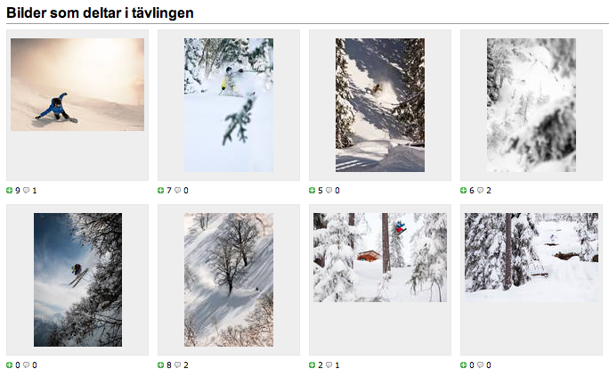 Över 300 bilder deltar i Freerides och Peak Performance fototävling. I söndags var sista dagen för att ladda upp bilder till tävlingen och för att vara med och påverka resultatet ska du lägga dina röster på dina favoritbilder senast på onsdag. Henrik Windstedt och Freeride utser sedan vinnarbilden bland de tio bilder som flest har ”+gillat”. På torsdag presenteras vinnaren här på freeride.se. Besök tävlingssidan för att lägga dina röster.