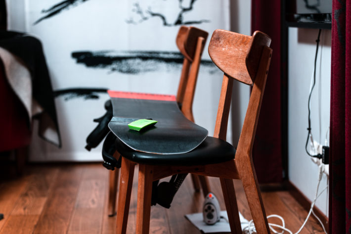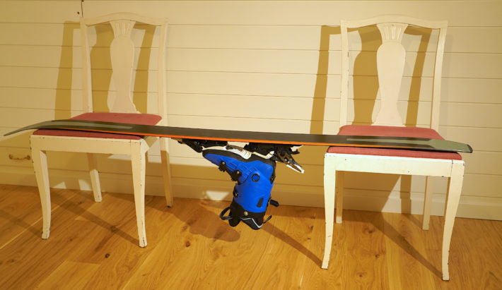 Om du inte har en specifik vallabänk med skidhållare går det bra att lägga skidorna mellan två stolar. Det kan vara fördelaktigt att trycka i pjäxorna, både som en stabiliserande vikt och för att hålla inne dina skistoppers. Många moderna bindningar håller inne sina stoppers om man trycker ner häldelen, annars kan man lösa det med ett kraftigt gummiband eller spännband.