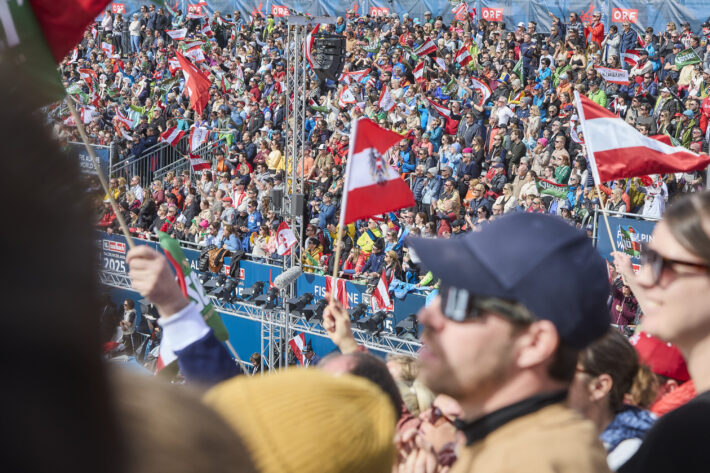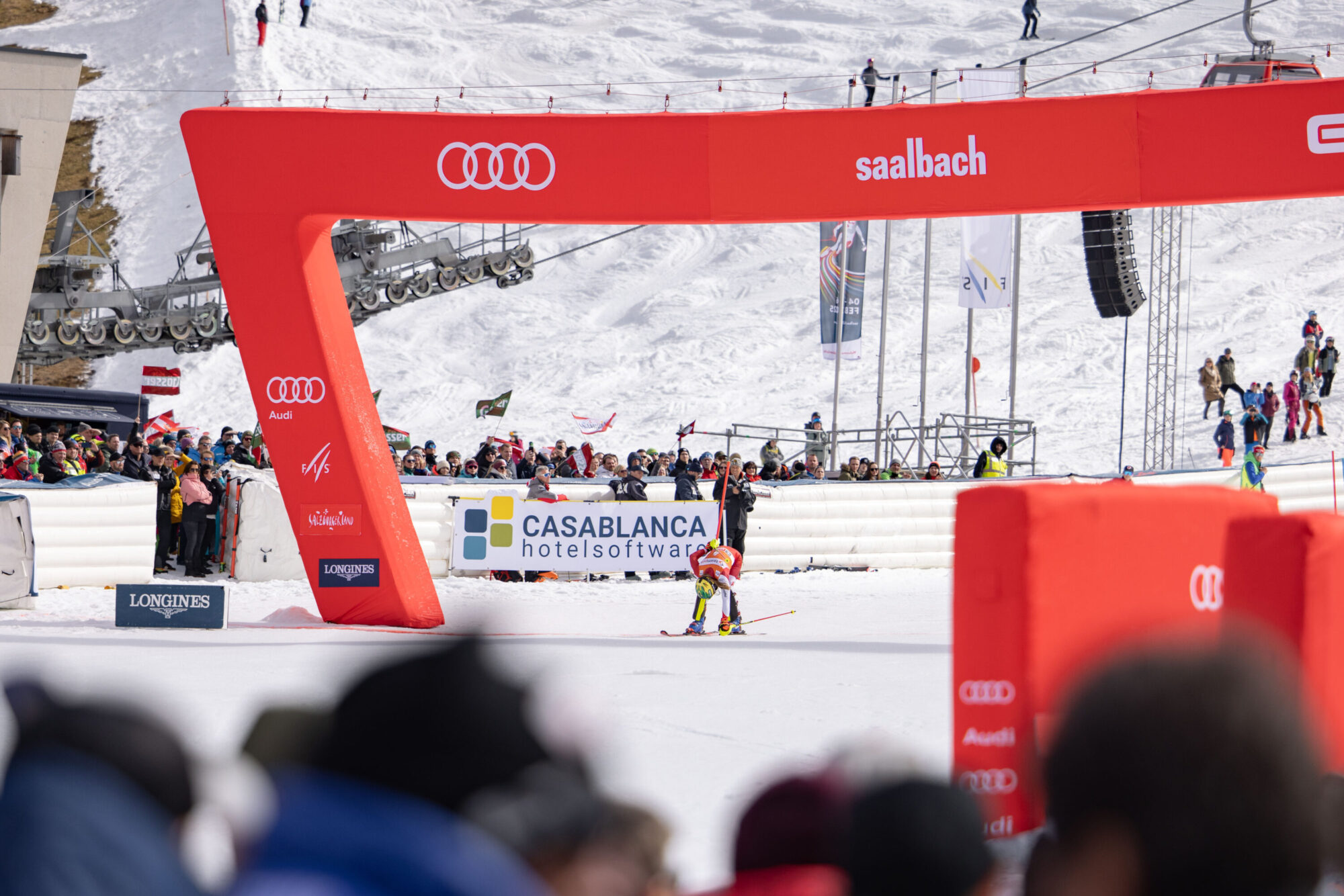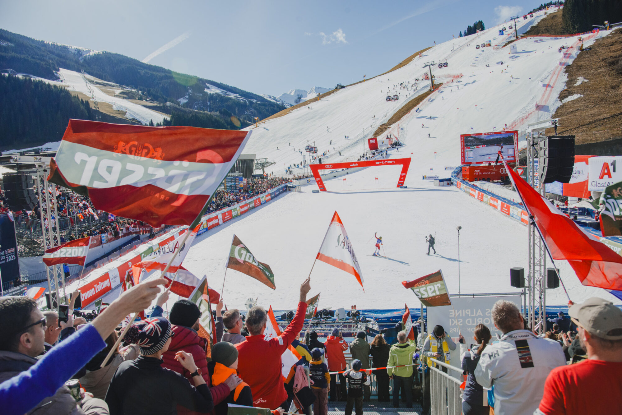 Stämningen i Saalbach är enorm. Det känns som hela Hinterglemm verkligen har väntat och förberett sig i detalj inför den kommande världscupsfinalen. Väderprognosen är extremt opålitlig, men tack och lov så är vädret ändå bra under damernas åk. Solen tittar fram och strålar på åkarna.