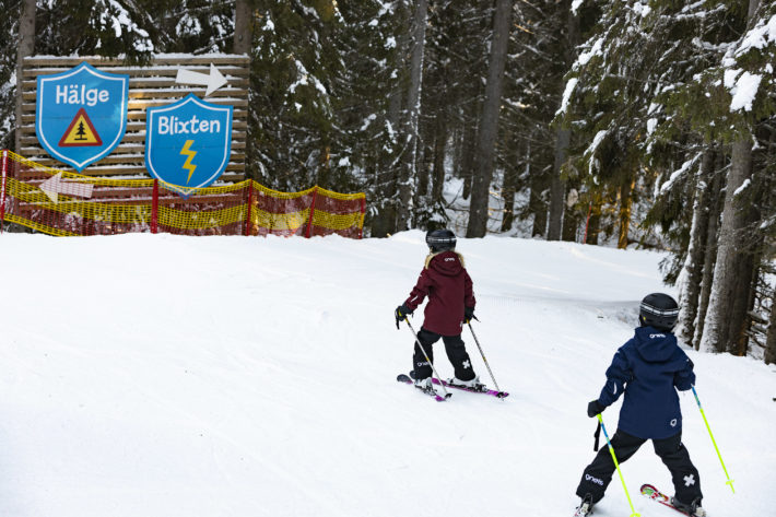 Pisten viker sedan av österut och de fria vyerna byts ut mot träd på båda sidor om nedfarten. Halvvägs ner pekar skylten Hälge/Blixten in till vänster. Leo tar fart och försvinner som en skidburen vessla in i skogen. Jag åker efter, men håller mig i pisten medan Leo svänger fram och tillbaka, åker upp och ner på skogbanorna bredvid. Inte långt efter kommer Meja. Jag provar en av banorna, men mina långa skidor (jag skyller på dom i alla fall) gör det svårt att hänga med i barnens tempo. Efter ett antal skogsbanor kommer vi som samlad trupp ner till liftarna.