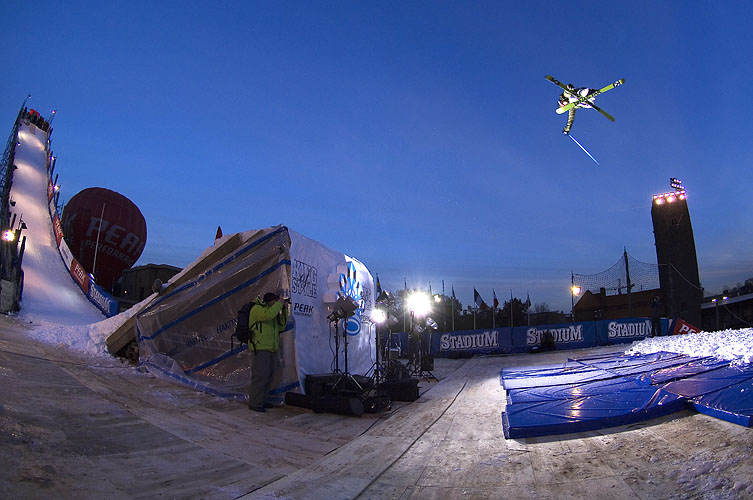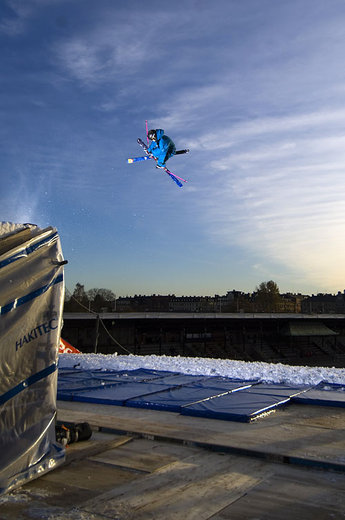 Till åkningen för kvällen så. Den branta rampen gav stora farter, över 70 km/h. Landningen skedde rätt ner på den täckta gräsplanen på stadion. Det stora hoppet (33 meter ovanför marken vid starten) bjöd på stora luftfärder genom den kalla stockholmsluften. Åkarna hoppade över 25 meter, cirka 17 meter över marken.