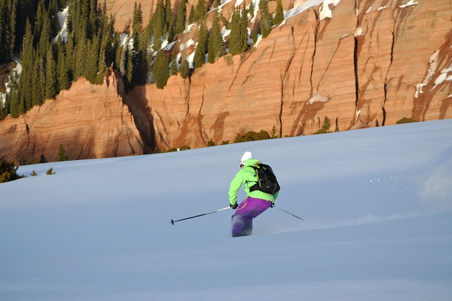 Skidåkning blir sällan så utmanande och varierande som under en lång heldagstur i mars. Med olika tekniska förutsättningar men med samma starka hemlängtan svänger vi nu in i tung snö genom de snåriga buskarna sista slutspurten mot vårt nattläger. Vi korsar bäcken en sista gång och glider lugnt och vilsamt hem över fälten. Till höger lyser kvällssolen mjukt på de knallröda maffiga klippväggarna som länge kantat bäckravinen.
