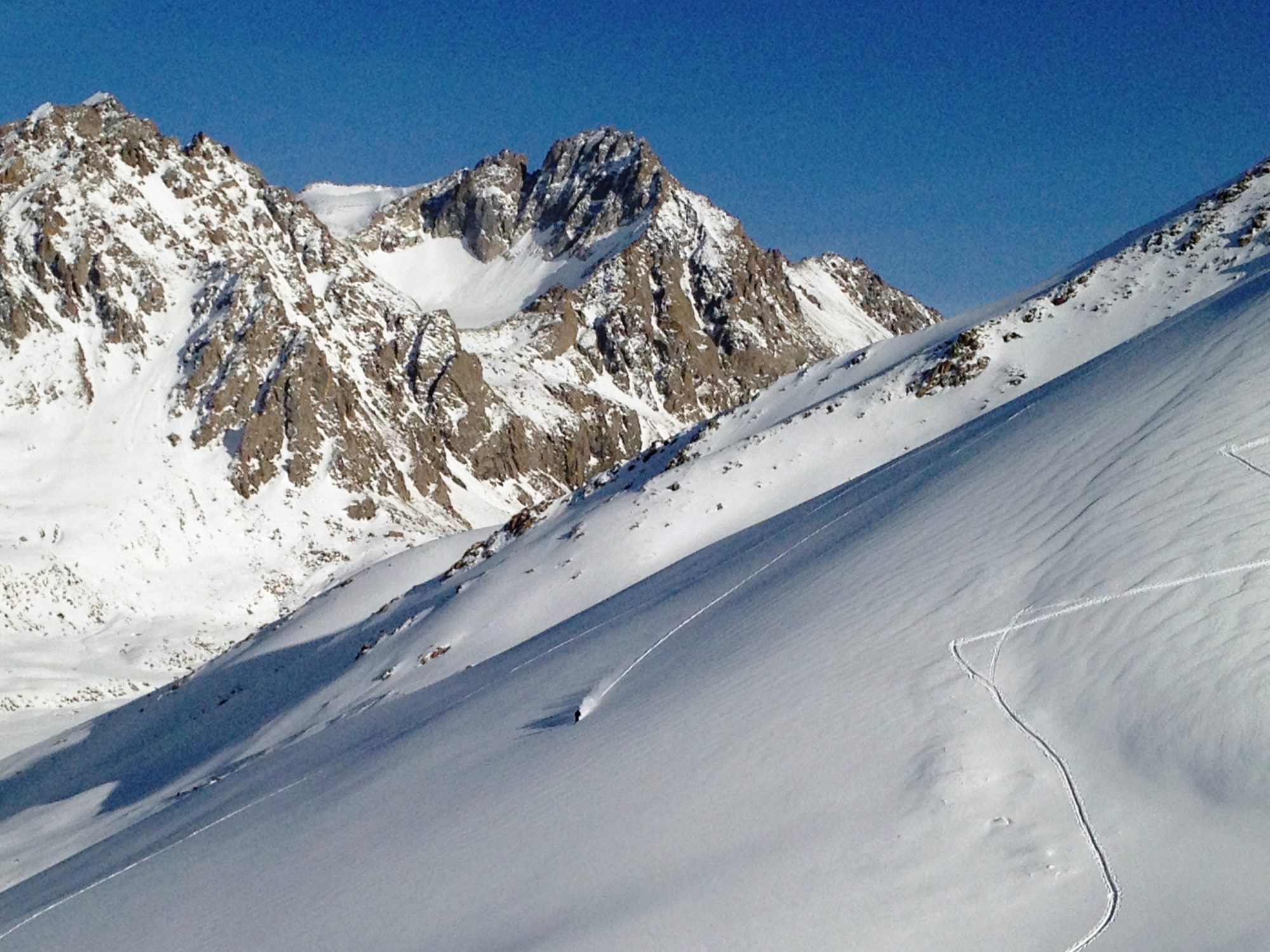 Dagarna på berget följer samma mönster med olika toppar som ska testas. Slava spårar och bryter terräng först i ledet och vi andra kämpar med att hänga på under den värmande marssolen. Vinden gör sig knappt påmind så vi tar långa och sköna luncher på topparna. Vi gör ett par toppar per dag beroende på dagsform. Det är ingen stress då detta är ny och obruten mark för skidåkare. Nedanför oss vilar alltid Issyk-Kuls vatten omgiven av toppar i olika färger som lyser upp landskapet. Längre in i massivet ser vi toppar som är över 5000 meter. Kirgizistan sägs bestå till 96 procent av berg.