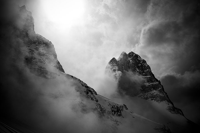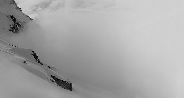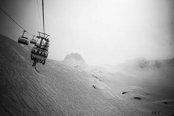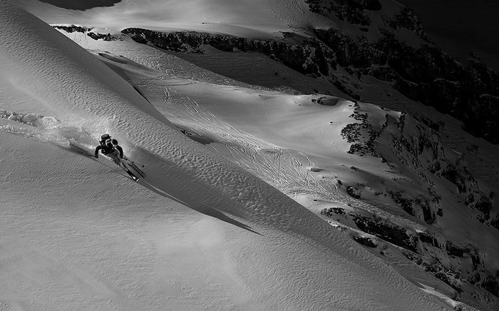 Det öppna landskapet gör att man kan hitta puder även under liften när det är nysnö. Något många verkar veta om.Det står även snart klart att det definitivt inte är jag som drar i några trådar i den här konstellationen utan snarare bergsguiderna, vars jobb ju är att hålla ex-alpinister med hybris vid liv och utan att skada sig allt för mycket. De agerar även därefter och är inte superflexibla när det kommer till att ha tålamod, vänta in och planera en bild eller vänta på att moln ska passera för att en bild ska bli lite bättre. Här är det tempo och säkerhet som gäller. Två saker som inte alltid är optimala för att en bild ska bli spektakulär. Vi håller oss mestadels till relativt spårade linjer och inget alltför riskfyllt. Något som är förståeligt, guiderna har ingen aning om hur många av oss har erfarenhet av laviner och riskerna i den här sortens åkning, men som också blir frustrerande för mig och Lars som jäkligt gärna vill ta ut svängarna mot möjligheter till roliga dropp, klippor och springor överallt. Något som det inte är läge för nu då det kanske skulle leda till vår onda bråda död och en del pinsamheter för Peak och vår bergsguide Tomas.