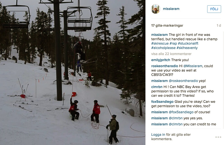 Lara Miller satt fast i liften i två timmar och delade med sig av erfarenheten på instagram när flickan framför firades ner: ”Flickan framför mig var livrädd, men hanterade räddningen som en mästare”.