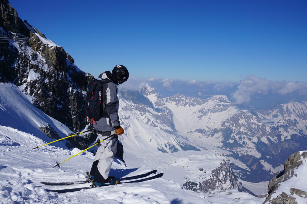 Jag är på väg upp i gondolen första dagen i Engelberg. Det har snöat några dagar tidigare, men just nu är det strålande sol och endast några minusgrader. Det känns som om vi kommer få en fin vecka. Jag säger till mina vänner i gondolen att jag ska ta det lite lugnt i början och känna på skidorna och värma upp min stela rygg. Tio minuter senare står vi på toppen av Titlis och vänder skidorna ner för det legendariska glaciäråket Steinberg.