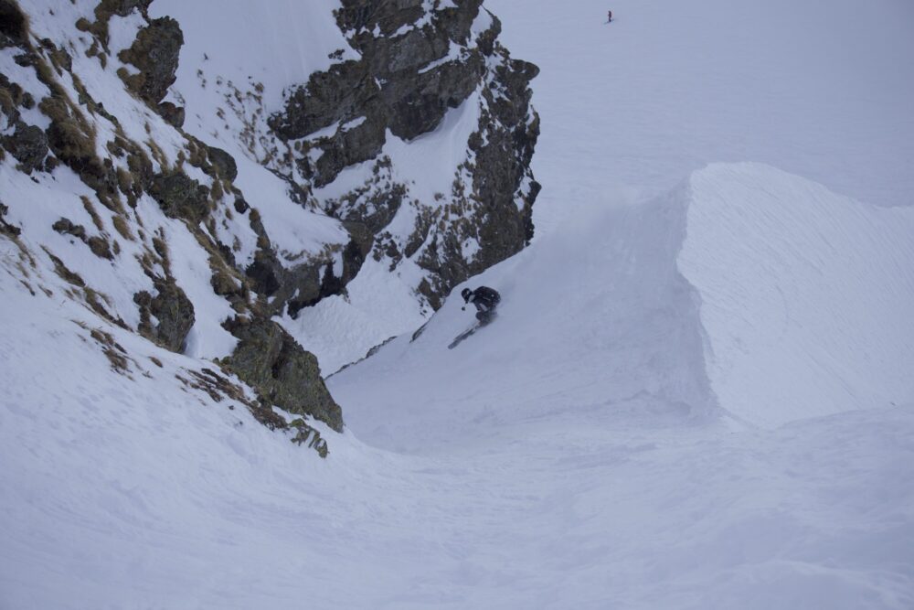 Under mitt andra åk hamnar vi, som av en slump, genast ovanför en klippa. En klippa som känns för stor, efter två säsonger av mysig svensk fjällåkning, men efter att bägge mina kompisar kastat sig obehindrat ut för den 5 meter höga droppet kan jag inget annat än att göra likadant. Jag fegar lite och landar lite kort. Stompar den hårda landningen men på grund utav min ringa försäsongsträning orkar jag inte stå på mina fötter. Jag ramlar omkull och börjar tumla nedför berget. Efter en eller två kullerbyttor är jag åter på fötter.