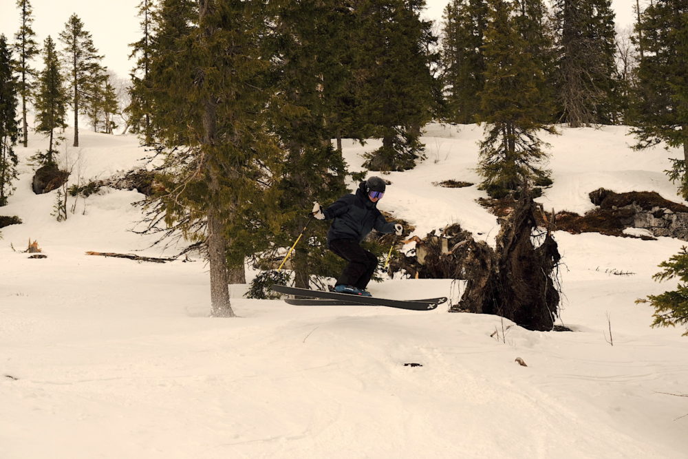 Jag börjar därav med en heldag i pisten. En gråmulen dag innan påsk, sikten är okej, föret är till en början stenhårt, men en bit in på eftermiddagen övergår det i klassiskt slaskigt vårföre. Detta ger mig möjligheten att testa skidan i olika förhållanden. Min avsikt med dagen är att trycka på skidan ordentligt och se vad den går för. Full fart i pisten, brant och platt, testar isgrepp och skidans stabilitet. Vidare till lite rollers och butter-3:or för att pusha den när det kommer till lekfullheten. Trots att det inte bjuds på något puder i Tegefjäll/Duved den här dagen så harvar jag mig igenom Tegeskogen i full kareta ett par gånger för att se hur den beter sig även utanför pisten. Deras progressiva rockerprofil känns perfekt proportionerad och tar sig ann det stökiga föret utan konstigheter.