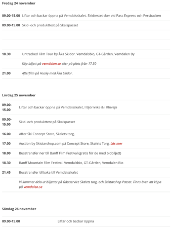 Förutom chansen att klämma på säsongens nya prylar kan du dessutom bli fullmatad med inspiration genom att besöka någon av helgens filmfestivaler. Fredag kväll gör Untracked Film Tour ett besök på Vemdalsbion i Vemdalen By och på lördag kväll kan det blåa programmet från Banff Mountain Film Festivals Sverigeturné ses på samma plats.