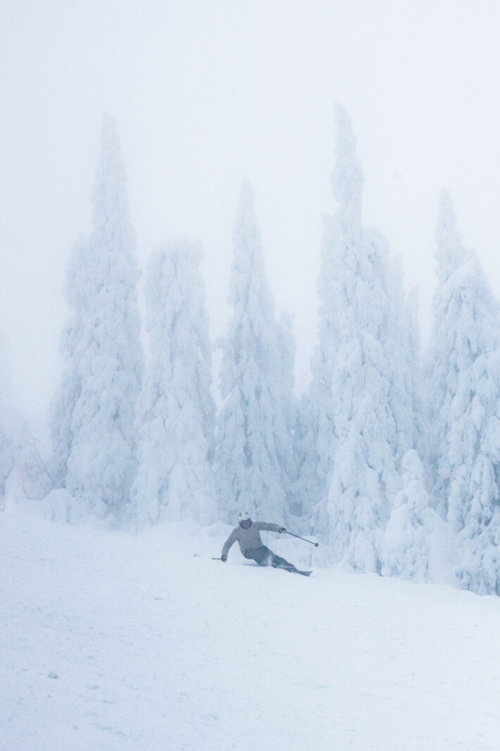 Nåväl, dags att lägga de första spåren med Rossignol Sender 106 Ti Plus. Sikten är för tillfället obefintlig vilket är extra läskigt med nya åkdon under fötterna. Det förvånar mig dock hur pass trygg jag känner mig med dessa skidor och jag märker snabbt att jag vågar stå på och låta farten öka trots att jag inte har full kontroll på hur underlaget egentligen ser ut till följd av den dimmiga väderleken.