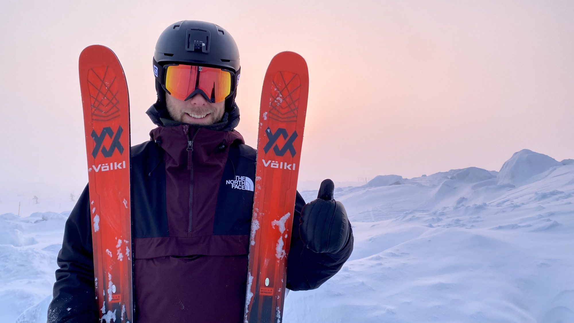 Vi ligger sida vid sida mer eller mindre hela åket, och ju längre backen lider, desto större svängar tar vi båda. Ingen tar paus trots att det är ett rätt långt piståk för att vara i Skandinavien. Sista biten släpper jag bara rakt ner och kolfiber-smattret från brättena låter mig veta att detta är en stabil, relativt tung skida men med ett livligt inslag. Nere igen vet jag inte riktigt vad jag håller på med, men att mitt leende är precis lika illmarigt och stort som Jokerns i Batman. Detta är en sorts skidglädje för mig, vid sidan av annat som exempelvis att åka puder. Hatten av till laggen under pjäxorna, ”vinsten” är definitivt till stor del en frukt av Völkl Mantra M6:s sjukligt goda egenskaper i brant och hårt pistföre.