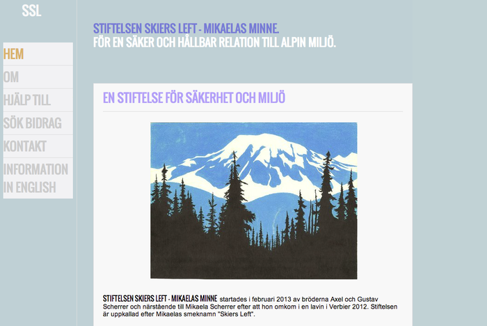 För drygt två månader sedan, 19 december 2012, förändrades allt. Mikaela Scherrer avled efter att ha dragits med i en stor lavin i schweiziska Verbier. Dagen därpå åkte hennes familj ner till Verbier medan vännerna i Stockholm sökte tröst hos varandra. Ganska snart, som en del av bearbetningen av sorgen, uppkom tanken på att grunda någon form av stiftelse för att hedra Mikaelas minne. Tankarna konkretiserades snart i Stiftelsen Skiers Left – Mikaelas Minne.