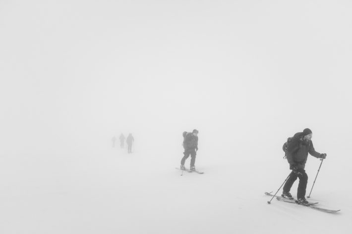 Vinden slår mot min vänstra kind, allt är vitt och jag ser endast konturerna av personen framför mig. 70 höjdmeter kvar till toppen. Jag fäller upp luvan för att få skydd och samtidigt som jag krånglar för att stänga alla ventilationsöppningar får jag en stark känsla av välbefinnande. Jag uppskattar verkligen bergets kontraster, nyss gick hela gruppen i samlad klunga och småpratade till stighudarnas gnällande ljud mot Lill-Anjeskutans vindpinade snötäcke. Nu kämpar vi tysta och ensamma, men ändå ihop. Uppåt, framåt.