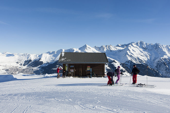 Toppen av släpliften Grand-Tsai 2 232 meter över havet på andra sidan dalen till vänster syns Verbier, sockertoppen Mont-Gelé syns rakt ovanför lifthustaket.