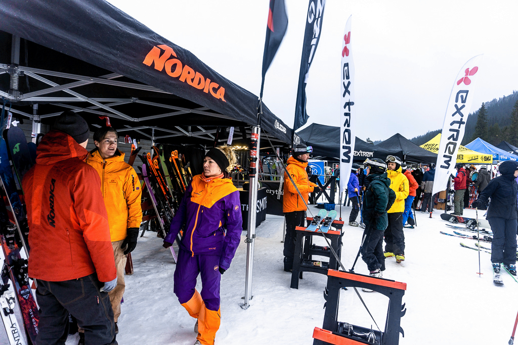 Mammut kör transcieversök bakom sin gigantiska uppblåsbara mammut Manny. I det minst sagt begränsade snötäcket känns det inte så verklighetstroget, men utan tvekan bra träning ändå. Smith lånar ut gogglar för bästa sikt bland molnen, och det gör även Bliz. Bland skidmärkena syns förutom Nordica även Icelantic, Völkl, Atomic och cirka femton till.