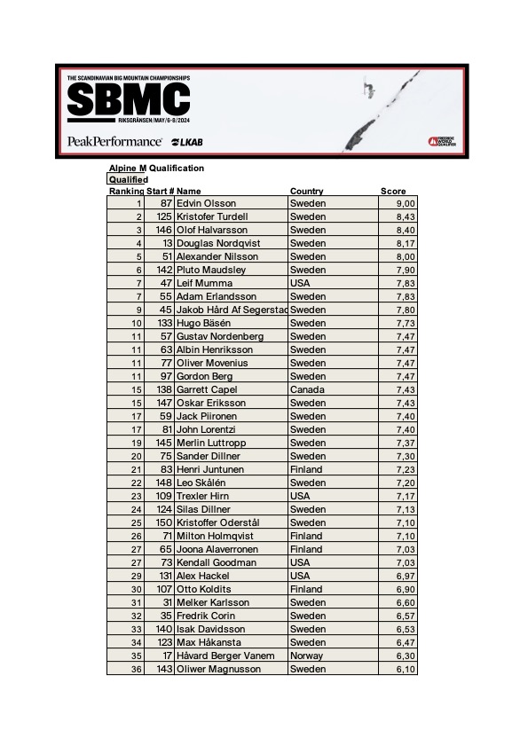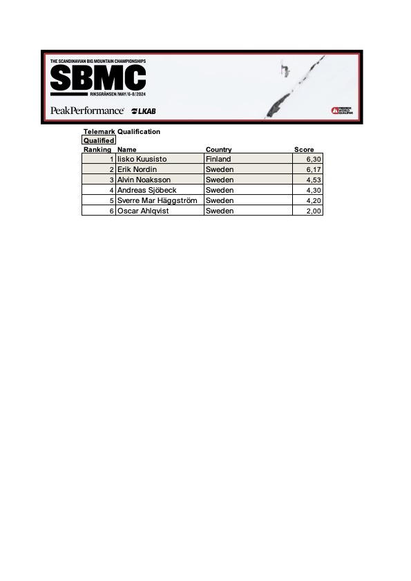 I år har vi äran att få se en återkomst av telemarksklassen! Sex åkare från Sverige och Finland på start och den absolut ståsäkraste av alla klasser. Hälen är lös, knäna är böjda och traditionen är stark. Iisko Kuusisto från Finland kör en rockride på Kvalklippan och visar riktigt åkglädje. Sverre Mar Häggström och trefaldiga vinnaren Erik Nordin åker det branta till höger nedifrån sett, för att bägge avsluta med Kvalklippan.