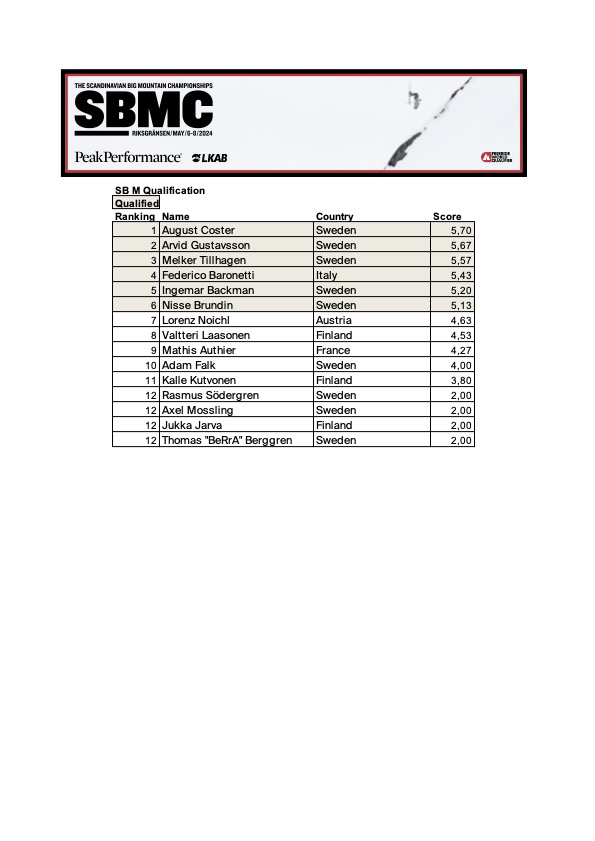 Snowboardåkarna har det inte lätt i den hårda snön. En stålkant greppar klart mindre än två. Vi får se flera åkare ta sig an facet med rumpan som åkdon. Tidigare Rookie Of The Year August Coster kör en lekfull linje långt bort österut i facet, och får det faktiskt att se ganska kul ut. Arvid Gustavsson kör snyggt och får med sig ett litet flyg. Axel Mossling tumlar ned för samma linje och tappar vad som var startfältets snabbaste glajjor. Legenden Ingemar Backman kör sitt livs andra friåkningstävling och bjuder oss på en 360 uppe på krönet.