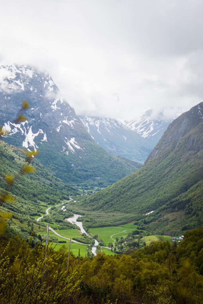 Härifrån ser vi hela vägen ned till den idylliska byn Hjelle och glaciärsjön Oppstrynsvatnet. Där står sommaren i full blom och det är en kavalkad av färger nere i dalen och det känns nästan surrealistiskt att stå här i full skidmundering. Men det är också detta fenomen som gör Stryn så fantastiskt, det är på riktigt sommar och vinter samtidigt.