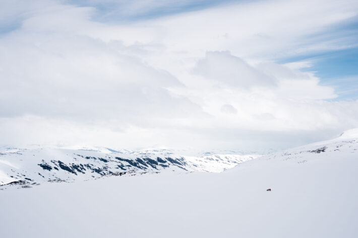 Vid det här laget har tyvärr snön blivit rejält klistrig vilket försvårar åkningen. Stämningen är dock fortfarande på topp och det är rätt och slätt glada miner bland samtliga i gänget. Åket är långt och varierande Tids nog kommer vi ned till den slingriga Gamle Strynefjellsvegen där en minibuss strategiskt står och väntar på oss. Har vi klarat oss från att gå så här länge ska vi minsann inte behöva gå sträckan tillbaka till skidanläggningen nu heller.