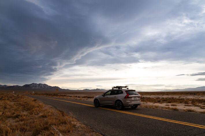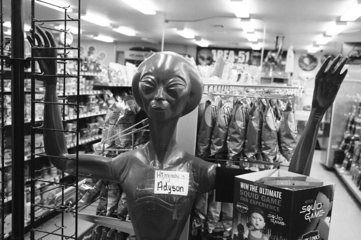 Vi har precis lämnat Las Vegas och kör nordväst. Det mesta av landskapet ligger fortfarande i mörker och våra kaffemuggar i amerikansk storlek slåss om utrymme i kopphållarna i svensk storlek. I backspegeln på Volvon ser vi vad NASA utnämnd till världens ljusaste plats, bli mörkare och mörkare. Ovanför halvljusen är motorvägen spikrak och till synes oändlig. Men vi hinner bara 15 mil mot South Lake Tahoe innan vi måste stanna. Av en slump hittar vi Area 51 Alien Center, i utkanten av det annars anonyma Amargosa. Det är svårt att inte skratta när vi går in i butiken som enbart är dedikerad till utomjordingar, det närliggande Area 51 och andra udda saker.