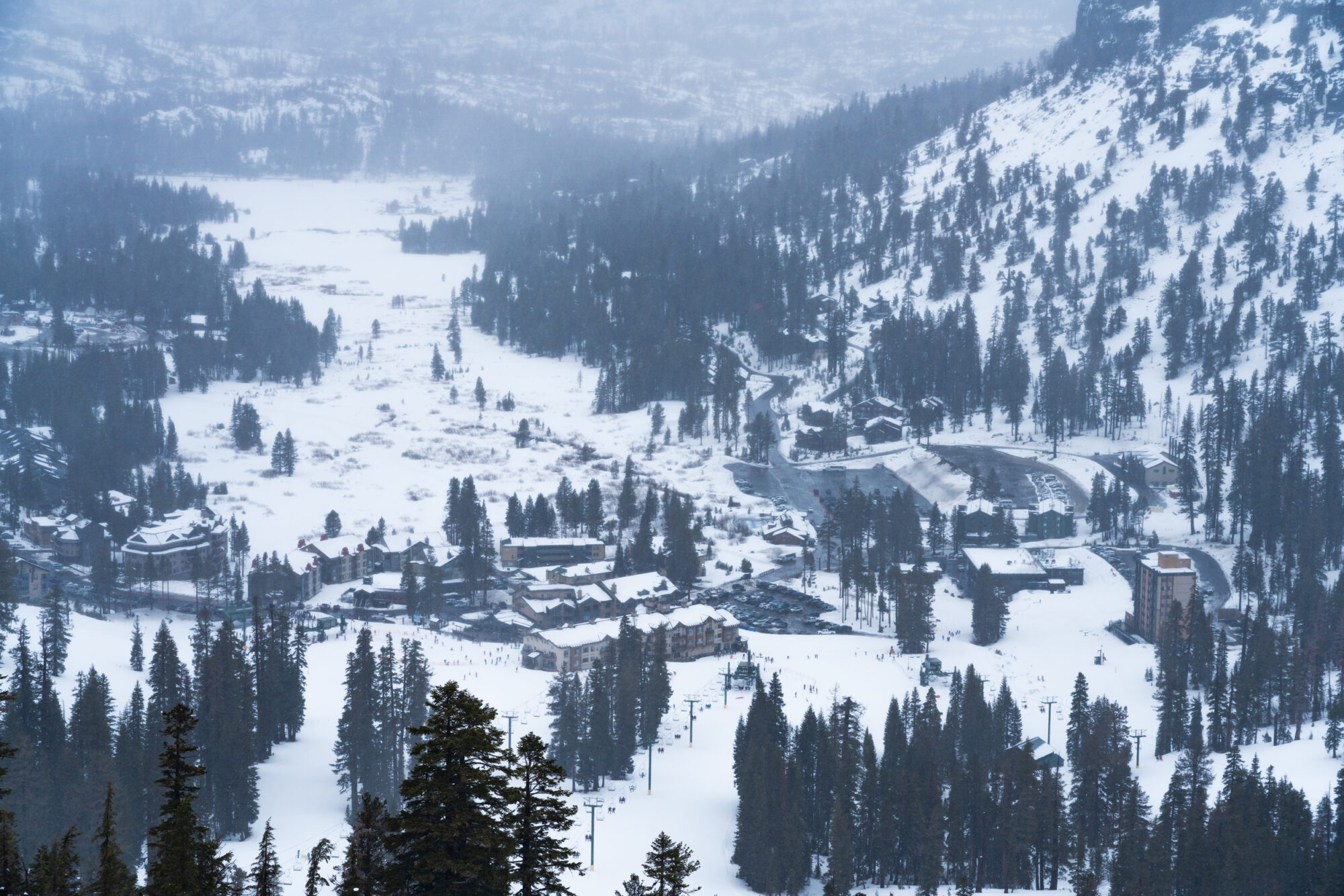 Lyckan hos två skidåkare krossas dock brutalt av regnet som slår mot de stora fönstren. Det är inte bara regn, utan det stormar som den värsta höststormen, i januari. Och de säger att klimatförändringarna inte är på riktigt. Vi hittar tillslut upp till Heavenly Gondola för vår första färd upp på berget. Hela staden är skrämmande grå, blöt och grön. Det känns mer som ett visset oktober än ett glatt skidåkar-januari. Gore-Tex och skallager i all ära, men ett paraply hade varit det bättre valet här. Gondolen skallrar in på toppstationen, och det är svårt att ignorera avsaknaden av nysnö. Eller snö överhuvudtaget för den delen. Heavenly Mountain Resort erbjuder ett ganska stort system med pister och liftar, som spiller över på Nevadas sida. Att se varför South Lake Tahoe är en sådan populär och legendarisk skidort är inte svårt att se, egentligen. Det är bara väldigt dimmigt just nu. När du väl kommit upp över den första stora klippkanten med gondolen så öppnar ett stort område med skidåkning framför skidspetsarna upp sig.