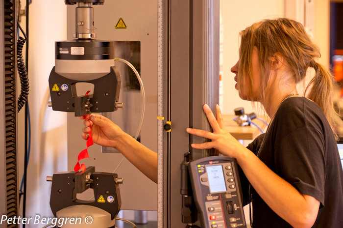 Lisa Nilsson testar rivstyrka i ett klädesplagg i labbet.