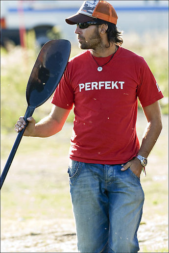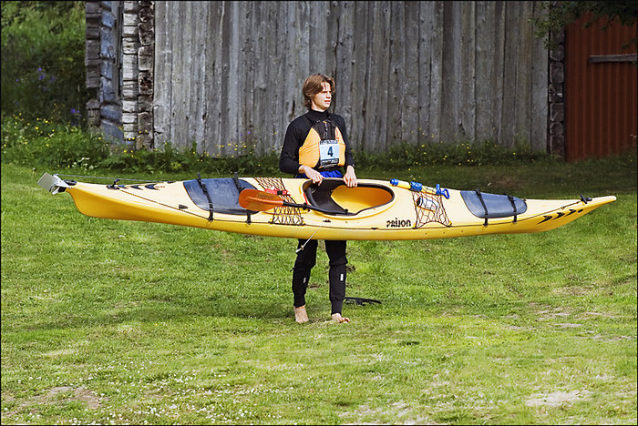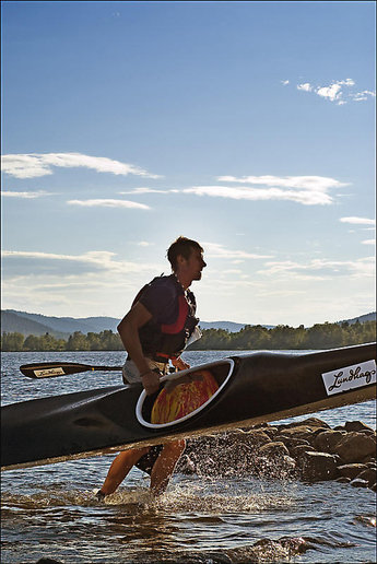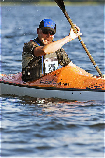 Alla springer till sina kajaker som ligger på strandkanten. Nummer 26 vann tävlingen.