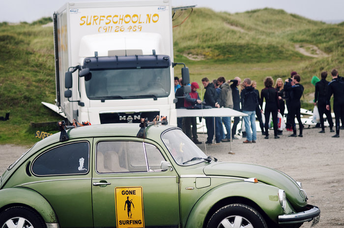 Den portabla surfuthyrningen har parkerat vid Borestranden och hyr ut brädor till en skolklass från Oslo.