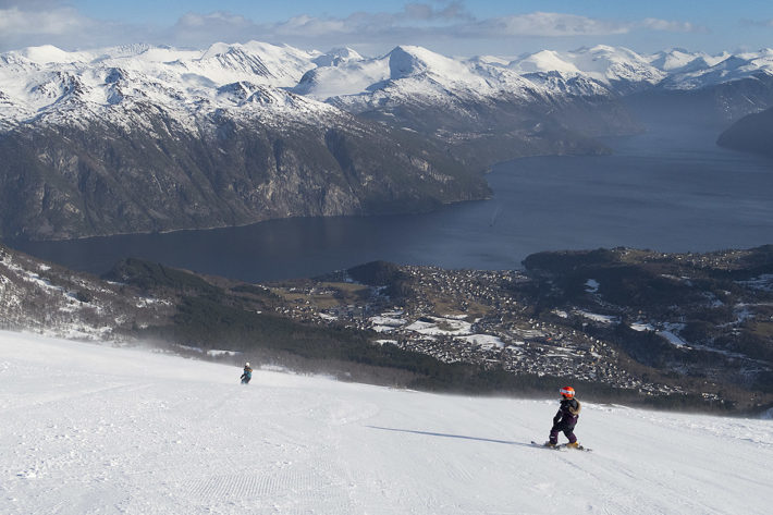 Efter fyra veckor med massor av härliga dagar i backen och goa kvällar med barnen var det dags för sista skiddagen på vår mini-säsong. Vi tar oss till Roaldsheise en sista gång. Solen skiner och över horisonten svävar ett par moln. Under oss ligger den blåa fjorden: