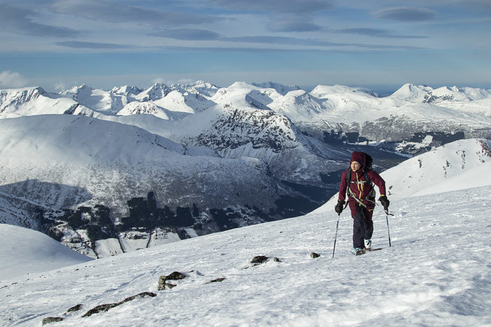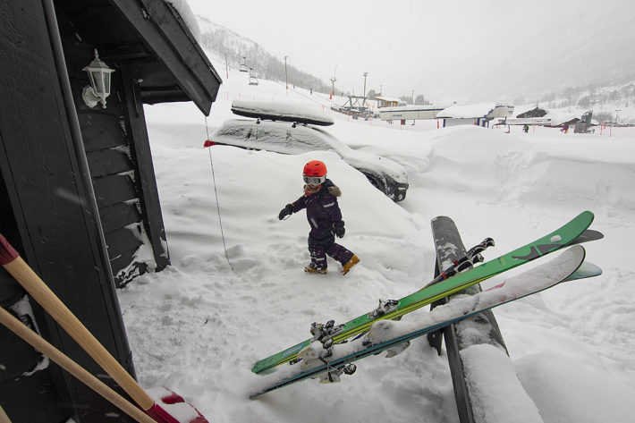 Eftersom värmen hade slagit till och snötäcket var en aning ostabilt så valde vi Fremste Blåhornet, med starten en cirka 20 minuter lång bilfärd från Hevsdalen, en topptur där lutningen aldrig överstiger 30 grader. Samtidigt som vi nästan blåste av toppen åkte barnen skidor med deras morbror i Stranda skisenter. Ett win-win upplägg helt enkelt. Och det här med vädret är utan tvekan den största nackdelen med området. Det kommer alltid mycket nederbörd här, men i perioder under vintern kan det lika gärna falla som regn. Och även blåsten ställer till det, framför allt i liftsystemet då gondolen och stolsliften, som tar skidåkare högt upp på bergen, stänger vid för mycket blåst. Detta hände oss ett gäng dagar under våra fyra veckor på plats.