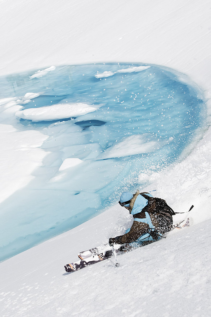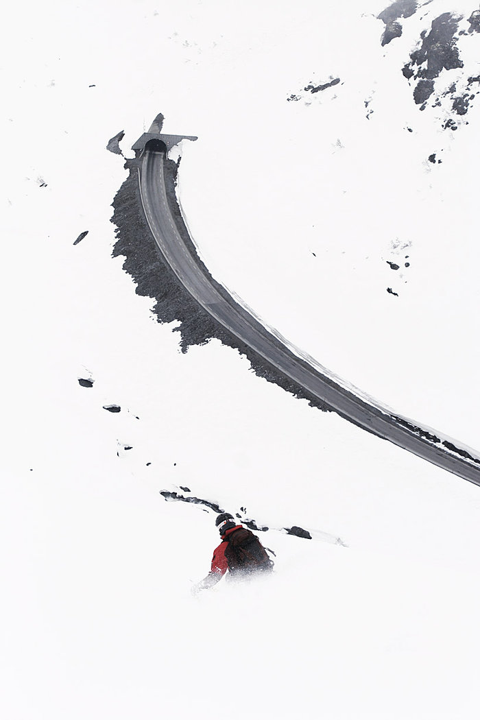 Fyrtiofem minuters promenad ovanför toppen av Breheisen och vänster från vägen upp till starten av SS Norway är det utvalda åket lokaliserat. Solen steker, och snön gnistrar i ljuset. Det luktar solkräm och svett. Vi pausar och dricker lite vatten för att förbereda oss för åket. Bergssidan under oss är brant, orörd och tekniskt intressant med små och stora klippor, samt några halvt uppstickande stenhajar som naturliga utmaningar. Siktet är inställt på en ränna långt till vänster som har sett spektakulär ut nerifrån.