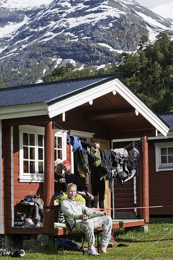 Nyckeln hämtas i receptionen. Vi låser upp dörren till en röd liten stuga med två våningssängar och ett kylskåp. Denna norsk hytte är lyxig i jämförelse med de tält som är uppslagna på campingens gräsmattor, och väl värd de 800 norska kronor som den kostar per natt. Vi somnar som barn trots att musiken från uteserveringen fortsätter att eka mellan Hjelledalens kilometerhöga bergsväggar.