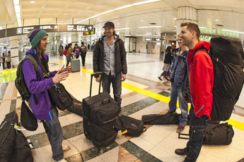 Foto: Niclas MagnussonFotografen Niclas Magnusson hade redan landat och förväxlingsrisken var minimal när han dök upp. Med truckerkeps, en kameraryggsäck lika stor som hela mitt bagage och en jibbtröja ned till knäna såg han ut att hålla ”Japan-size” men när vi kom närmre insåg jag att han var normalstor, att karln måste ha en sagolik förmåga att få med jättekollin som handbagage och att min egen klädsmak (samma storlek som kroppen) säkert är lite Hedenhös ur vissas perspektiv. Frans visste vi ingenting om men Pontus listade raskt ut att en blond europé med skidbagage och vilsen uppsyn antagligen hörde till oss.