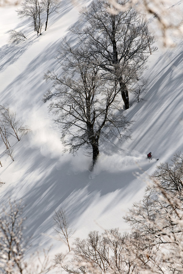 Äggen rymmer två-tre storväxta européer med feta skidor stickande ut till hälften och tar bekvämt sina resenärer upp till 1400 meters höjd. En sittlift till och man står på toppen av Mt Kenashi, 1650 meter över havet, med en fantastisk utsikt i vackert väder. Och det hade vi verkligen! Kanske lite varmt, men inget att oroas över. Vita träd avtecknade sig skarpt mot en himmel så blå att man skulle kunna ta den för trickfilmad och överallt såg vi gläntor, naturliga små rännor, hopp och traverser som bjöd in till äventyr. Åt ena hållet perfekt preparerade pister och ett litet sanktionerat offpistområde, åt andra hållet dal efter dal av puder och dolda naturupplevelser. Spåren under repen talade sitt tydliga språk… även om man ändrat policy officiellt körs det puder i Nozawa så det står härliga till.