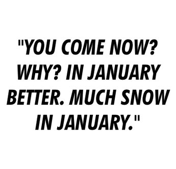 Snön blev gradvis tyngre och solskenet förbyttes i dimma och duggregn och till slut var inte ens pisterna bra längre. Varje gång man delade kabin med en japan fick vi höra samma sak. ”You come now? Why? In january better. Much snow in january. And next month. Much snow next month.” Tusan också! Samtidigt fick vi rapport om att det var kallt och snöstorm i Österrike. Jag trodde ett tag att ”Rain Man-Robert” skulle få en hjärnblödning när han ställdes inför detta faktum men prognosen lovade faktiskt snö några dagar senare vilket fick oss att stå ut.