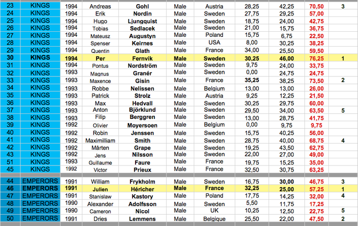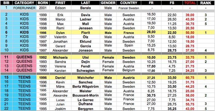 Kids-klassen, 12-13 år, vanns av den tretton år gamla fransmannen Dylan Florit från La Grave. Marco Ladner från Österrike tog andraplatsen och den sista pallplatsen tog svenske Erik Davis. Emperors-klassen, 19-20 år, vanns av Julien Héricher från Chamonix och Dries Lemmens från Belgien slutade tvåa och William Frykholm från Sverige kom trea.