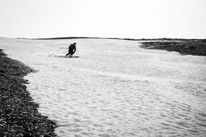 Snön är riktigt fin, faktiskt bättre än vad den varit på majoriteten av årets toppturer, och det är en speciell känsla att åka skidor på hemmaplan i juni månad.