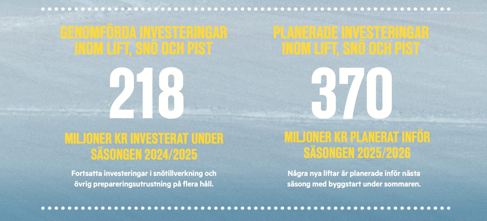 Under kommande vinter planerar skidanläggningarna i Sverige att investera cirka 370 miljoner kronor inom lift, snö och pist enligt en färsk branschrapport från SLAO – vilket är över 100 miljoner mer i jämförelse med föregående skidsäsong.