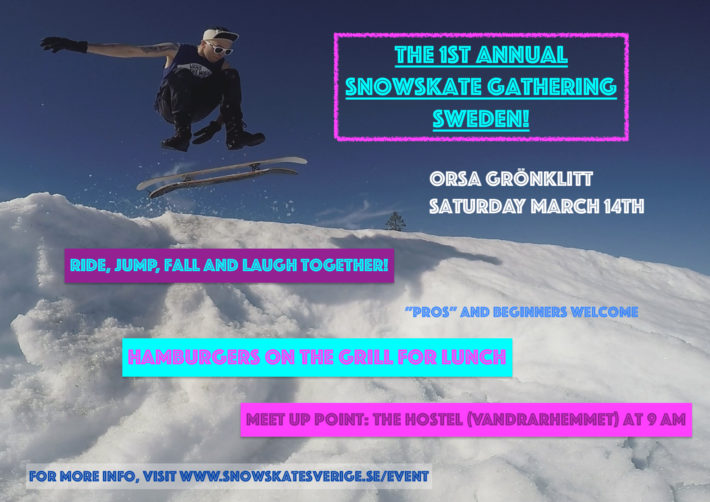 Lördag den 14 mars är det dags för Sveriges första Snowskate Gathering i Orsa Grönklitt. Ett event för alla snowskatefantaster i vårt avlånga land, men givetvis är även de som vill testa på för första gången välkomna.