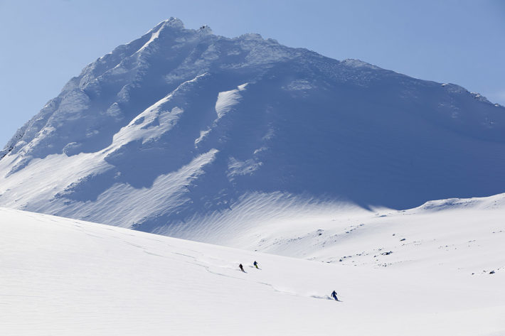 Skidåkningen ner från toppen till passet kan liknas överlevnadsskidåkning mellan alla stenar som sticker upp. Men från passet och ner mot glaciären är det bara att blåsa på. Du behåller farten ut över den flacka glaciären. Trots den flacka lutningen är frihetskänslans på topp när du swishar fram i skuggan med de röda bergstopparna runtomkring dig.