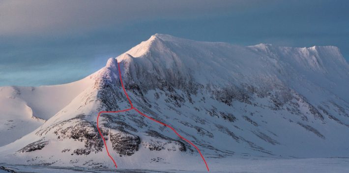 Mitt i Sverige, mitt i ingenstans. På gränsen till vildmarken och på gränsen till Norge i väster välsignas vi de tre följande dagarna med fint och klart fjällväder. Stormen lägger sig efter vår första natt, snö har fallit och vinden har – som så ofta i svenska fjällen – flyttat den till östsidorna. Vi utgår varje morgon från fjällstationen, gör den tråkiga men vackra anmarschen mot Sylmassivet och börjar sedan äta höjdmeter. Bestigningarna gör vi mestadels med skidorna på, men flera gånger är det såpass brant att vi behöver stegjärn, rep och isyxor för att ladda upp oss med de där sista vertikala injektionerna.