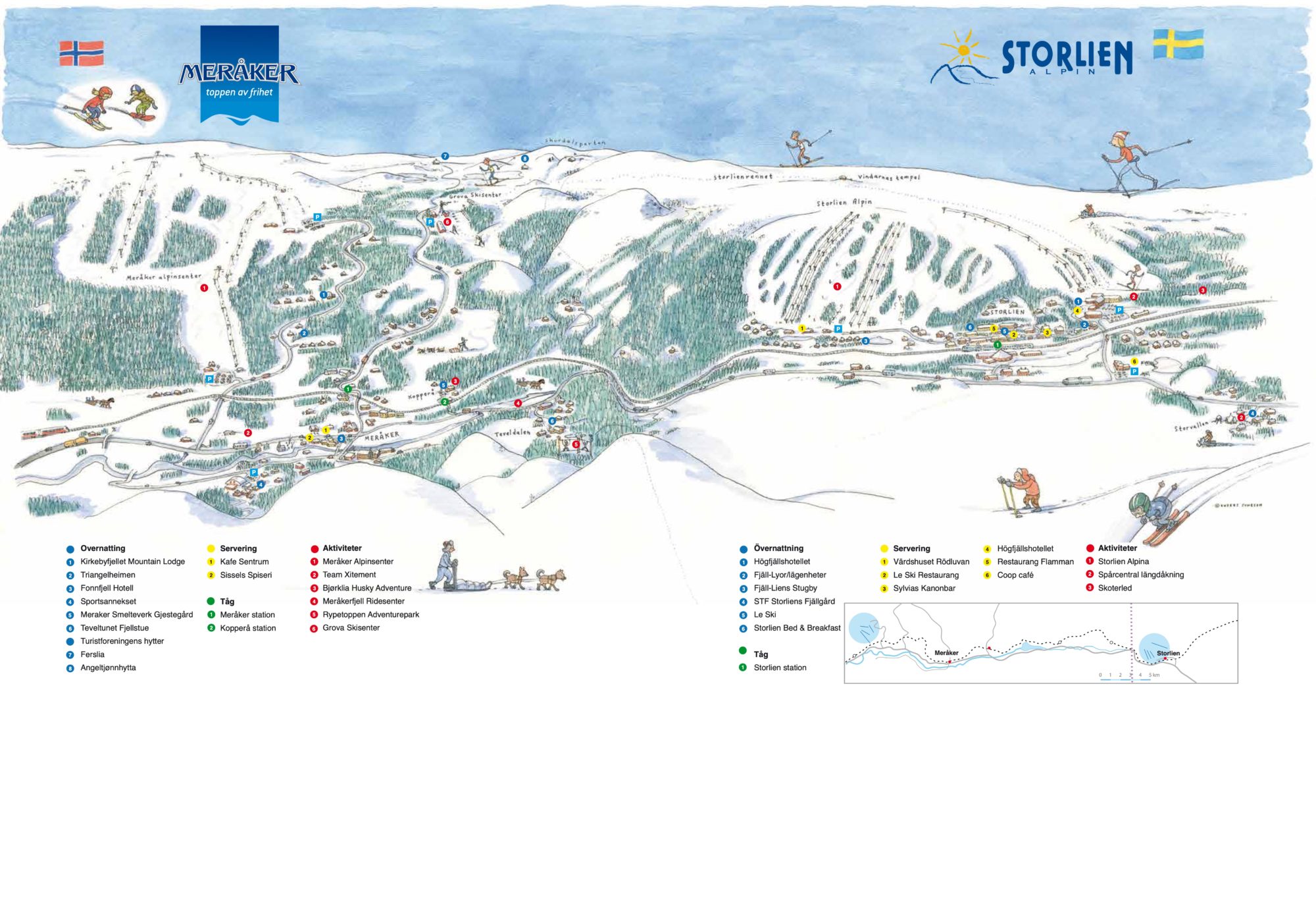 Storlien är den klassiska skidorten intill norska gränsen som bjuder på både alpin skidåkning och goda möjligheter till turskidåkning mot Blåhammarens Fjällstation. Högfjällshotellet har stängt, men givetvis finns det många andra boendealternativ. Mitt i byn vid järnvägsstationen ligger exempelvis LeSki och Storlien Apartments och tre kilometer utanför Storlien ligger STF Fjällgården vackert belägen vid foten av kalfjället med underbar utsikt mot Blåhammaren och Snasamassivet. Och på gångavstånd från järnvägsstationen ligger Fjäll-lien vid slalombackens fot.
