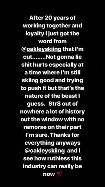Exakt varför Oakley väljer att klippa banden med den stora profilen är i nuläget oklart. Freeride har sökt Oakley för kommentar, men man ville inte säga något just i nuläget.