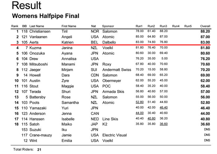 På damsidan vann Tiril Christiansen från Norge. Tiril skrapade ihop 88.20 poäng genom ett åk som bland annat innehöll två stycken 540s och en 720.