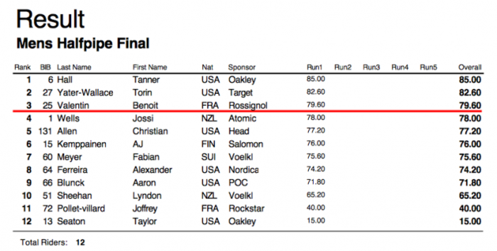 Tanner Hall gjorde sin första tävling på fyra år och vilken comeback han gjorde. Hall visade upp ett imponerande åk som bestod av en 900 tail, alley-oop 360 japan, switch 720 mute, till höger 900 safety innan en avslutande 1080 tail. Åket resulterade i 85 poäng och Tanner knep förstaplatsen före Torin Yater-Wallace som med sina 82 poäng körde till sig andraplatsen.