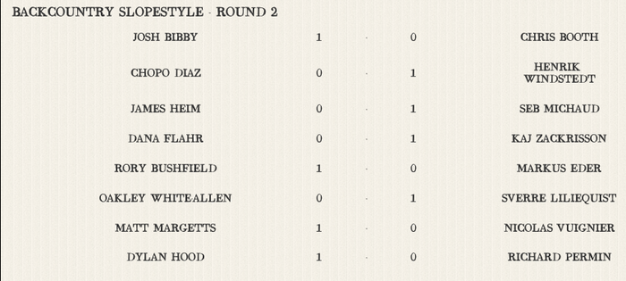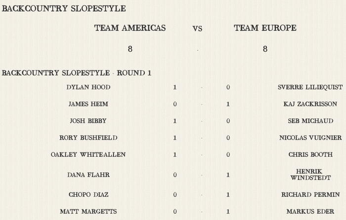 Windstedt langade en 720 och sågs dessutom dra en bakåtvolt på de naturliga kickarna i mitten av banan. Nico Vuignier och Richard Permin plockade fram varsin switch cork 540 och såg ut att trivas. När de första åtta heaten hade körts och man gick in i den andra omgången var ställningen 4-4 (totalt 10-6, fördel Europa).