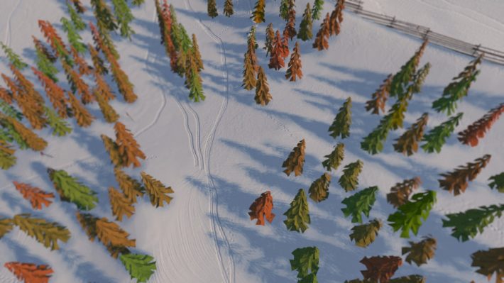- Grafiken är en underbar blandning av detaljerade berg med medföljande snö och den lite mer lowpoly-liknande stilen som träden och de olika byggnaderna är ritade i. Tillsammans med kamera perspektivet skapar detta en sorts diorama-aktig känsla.