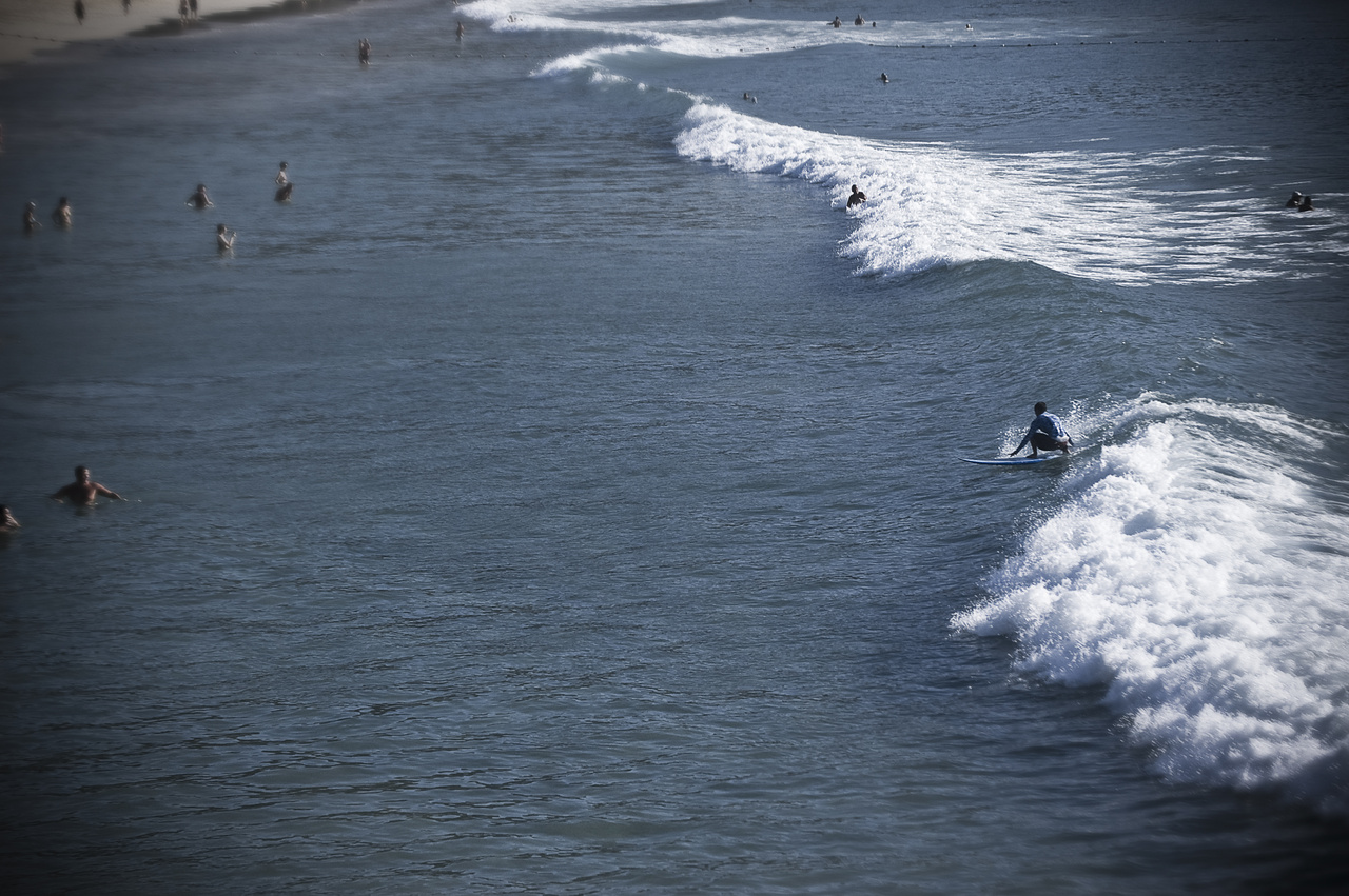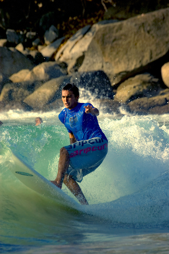 Framme vid surfspotet glöms mopedresan snabbt bort. En smal stentrappa leder ner till stranden. Klockan har precis passerat halv åtta på morgonen vilket betyder i att vi nästan är ensamma på stranden och i vattnet. Jag orkar inte stå och beundra morgonsolen särskilt länge. Med brädan under armen springer jag ut i vattnet som ligger på en beghaglig temperatur strax under 30 grader. Vågorna har ett klassiskt beachbreak vilket betyder att vågorna bryts relativt nära stranden och detta innebär i detta fall en korta paddlingsturer. Små vågor böljar till en början in och vi sitter ett litet gäng på våra brädor och väntar. Enligt Don kommer det att bli bra surf alldeles strax.