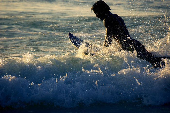Don tar ett par armtag inåt stranden för att säkert komma med vågen. Hans bräda lyder direkt och så fort vågen är under honom dras han med. Jag sitter kvar utanför brytet och ser ägaren av hotellet jag bor på leka på vågen. Hans ryggont verkar inte vara lika påtagligt som igår när det skulle bäras väskor. Strax därpå sitter han bredvid mig igen och ler med hela ansikte.